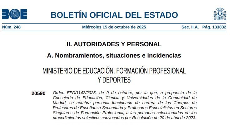 Orden EFD/1142/2025, de 9 de octubre, por la que, a propuesta de la Consejería de Educación, Ciencia y Universidades de la Comunidad de Madrid, se nombra personal funcionario de carrera de los Cuerpos de Profesores de Enseñanza Secundaria y Profesores Especialistas en Sectores Singulares de Formación Profesional, a las personas seleccionadas en los procedimientos selectivos convocados por Resolución de 20 de abril de 2023