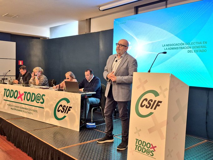 Miguel Borra, presidente de #CSIF, inaugura las jornadas de la Administración General del Estado.  Estamos haciendo un gran esfuerzo para lograr lo mejor para la ciudadanía y los/as empleados públicos, gobierne quien gobierne.  CSIF ha firmado un acuerdo histórico que consigue la jornada de 35 horas en AGE.  Este avance en las condiciones laborales del personal público se suma a otras mejoras como las incluidas en el Acuerdo Marco firmado por CSIF, que conlleva una subida del 11,4% hasta 2028 para los empleados públicos.