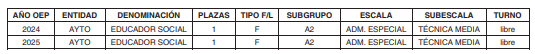 - Dos (2) plazas de Educador/a Social, pertenecientes a la escala de Administración Especial, subescala Técnica y clase Media, por el sistema de concurso-oposición, en turno libre.