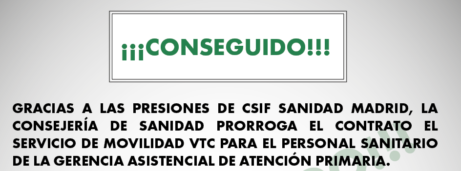 GRACIAS A LAS PRESIONES DE CSIF SANIDAD MADRID, LA CONSEJERÍA DE SANIDAD PRORROGA EL CONTRATO EL SERVICIO DE MOVILIDAD VTC PARA EL PERSONAL SANITARIO DE LA GERENCIA ASISTENCIAL DE ATENCIÓN PRIMARIA.