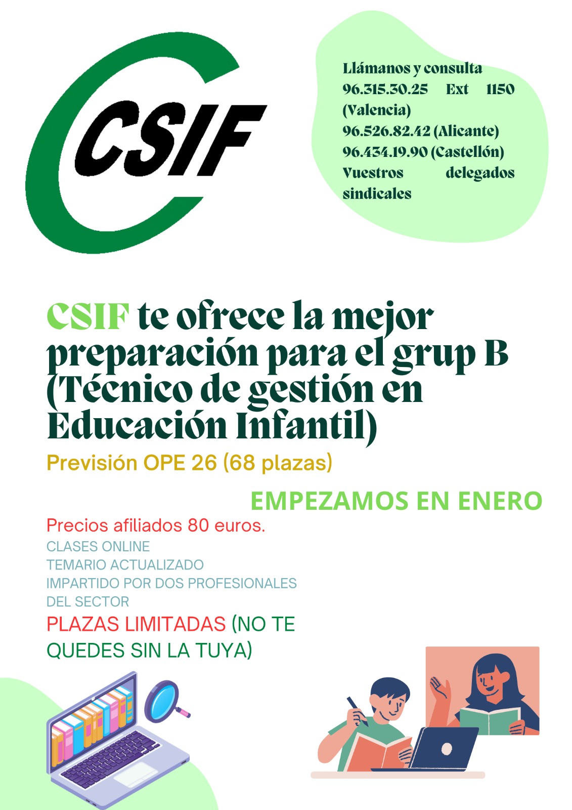 CSIF te ofrece la mejor preparación para el grupo B (Técnico de gestión en Educación Infantil)