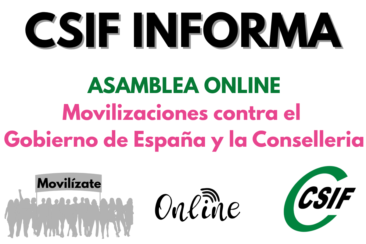 CSIF convoca asamblea online para explicar las movilizaciones previstas contra el Gobierno de España y la Conselleria de Educación.