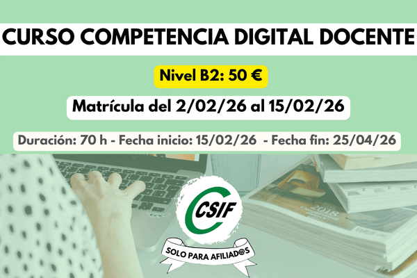 CSIF, como entidad colaboradora de la Conselleria, facilita la obtención del nivel B2 de Competencia Digital Docente mediante el curso: “Formación específica de acreditación en competencia digital docente: nivel B2” Actividad formativa autorizada por la Conselleria de Educación.