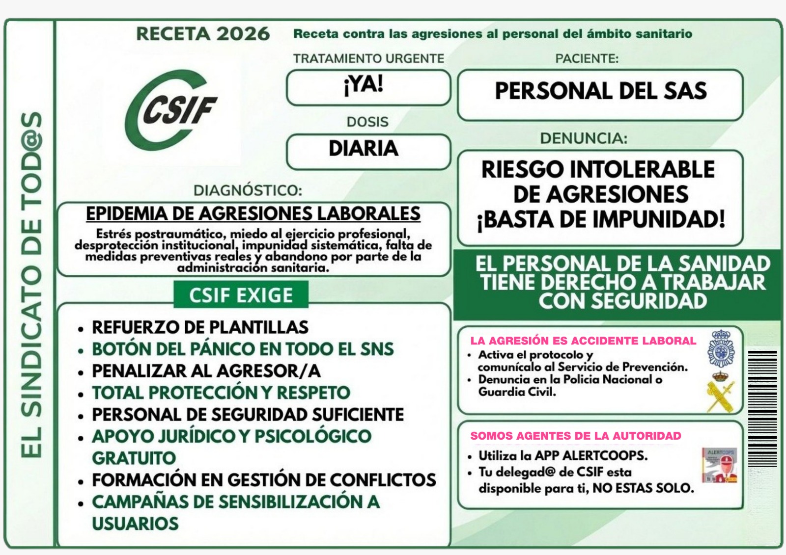 La implicación de la central sindical frente a este problema creciente en el día a día de los centros sanitarios es total y, por ello, CSIF ha puesto en marcha una campaña nacional que, bajo el nombre Receta 2026 contra las agresiones al personal del ámbito sanitario, pretende visibilizar la gravedad de la situación y denunciar que el personal de la sanidad está sufriendo una auténtica epidemia de agresiones laborales. La campaña emplea, de manera simbólica, el formato de una receta médica para alertar sobre esta realidad y reclama medidas urgentes que garanticen entornos laborales seguros en todo el Sistema Nacional de Salud, lo que incluye por supuesto al SAS.