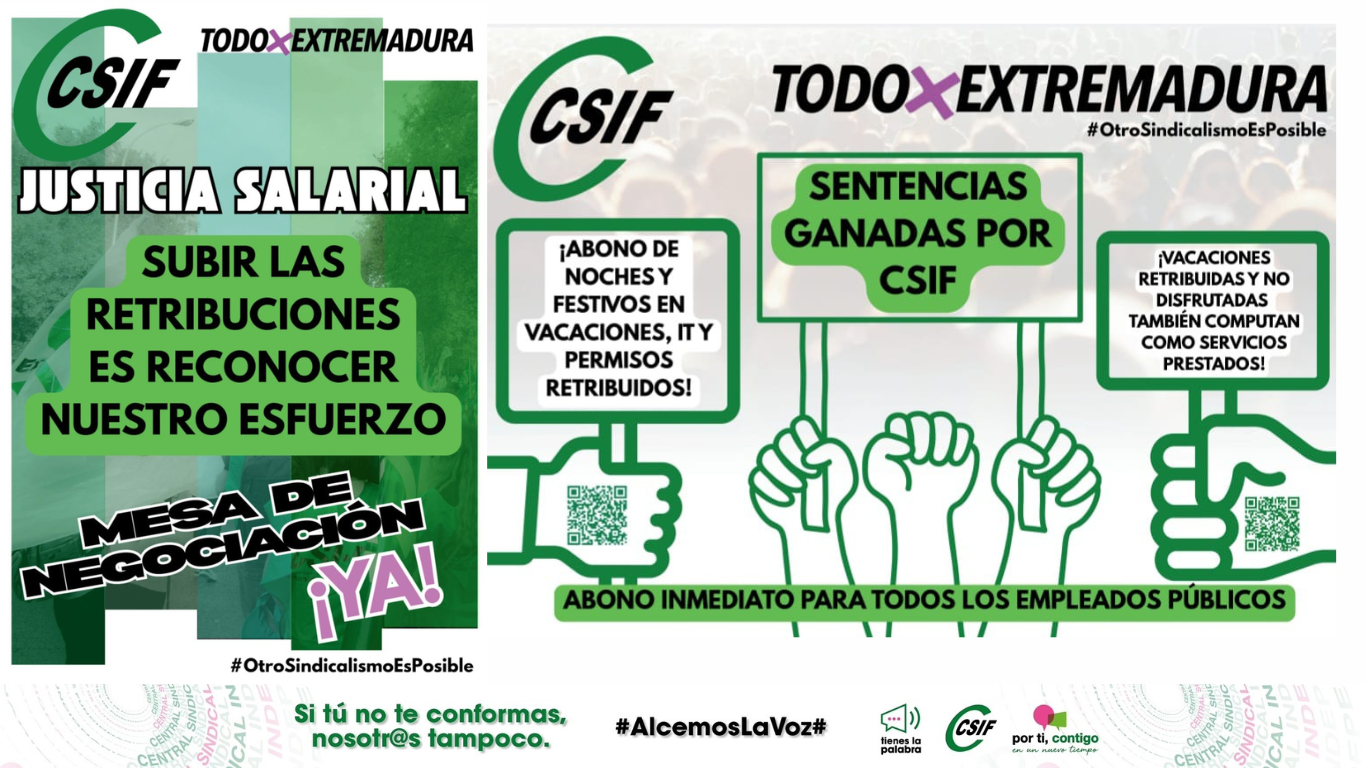 CSIF exige a la Administración la equiparación salarial de los Empleados Públicos de la Administración General de la Junta de Extremadura y el cumplimiento de las sentencias sobre el abono de noches y festivos en vacaciones, IT, y permisos retribuidos.