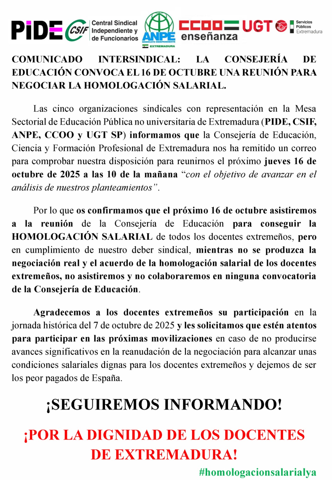 Las cinco organizaciones sindicales con representación en la Mesa Sectorial de Educación Pública no universitaria de Extremadura (PIDE, CSIF, ANPE, CCOO y UGT SP) informamos que la Consejería de Educación, Ciencia y Formación Profesional de Extremadura nos ha remitido un correo para comprobar nuestra disposición para reunirnos el próximo jueves 16 de octubre de 2025 a las 10 de la mañana “con el objetivo de avanzar en el análisis de nuestros planteamientos”.