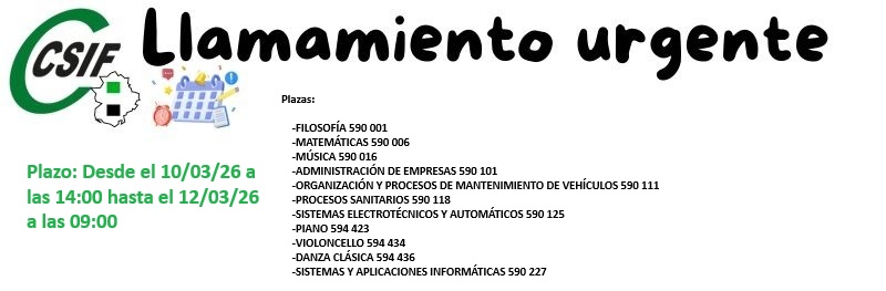 LLAMAMIENTO URGENTE: 10/03/2026. Plazo: Desde el 10/03/26 a las 14:00 hasta el 12/03/26