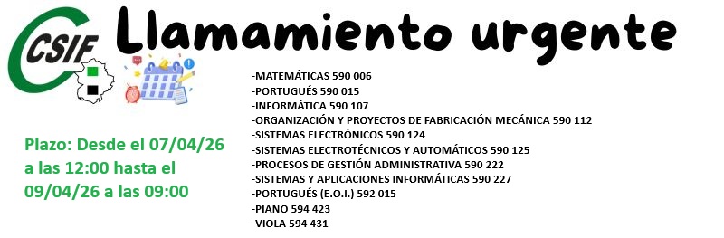 LLAMAMIENTO URGENTE: 07/04/2026. Plazo: Desde el 07/04/26 a las 12:00 hasta el 09/04/26 a las 09:00