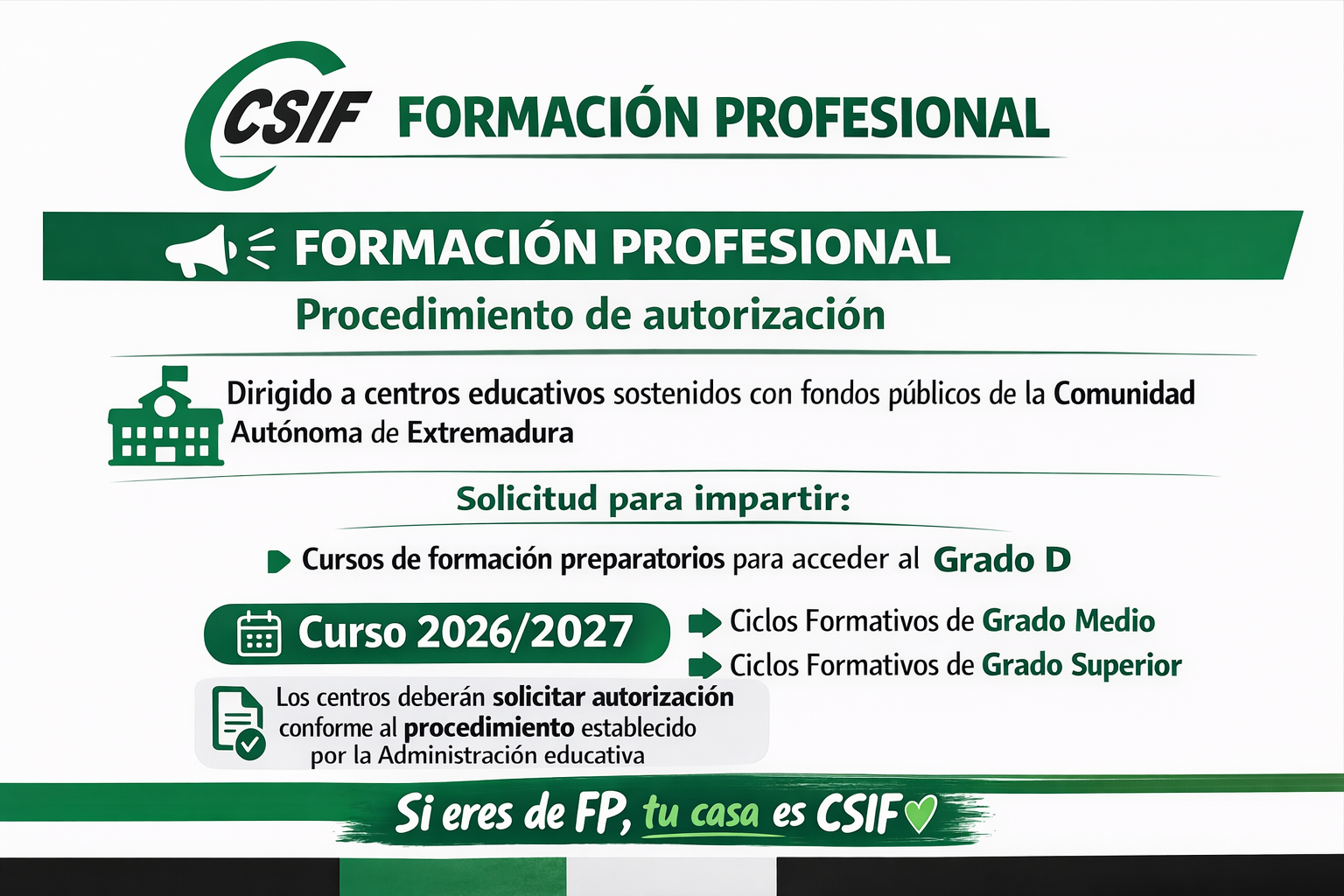 Resolución de 1 de abril de 2026, de la Dirección General de Formación Profesional, Innovación e Inclusión Educativa, por la que se convoca el procedimiento para que los centros educativos sostenidos con fondos públicos de la Comunidad Autónoma de Extremadura soliciten autorización para impartir los cursos de formación preparatorios para acceder al Grado D, ciclos formativos de Grado Medio y de Grado Superior, durante el curso académico 2026/2027.