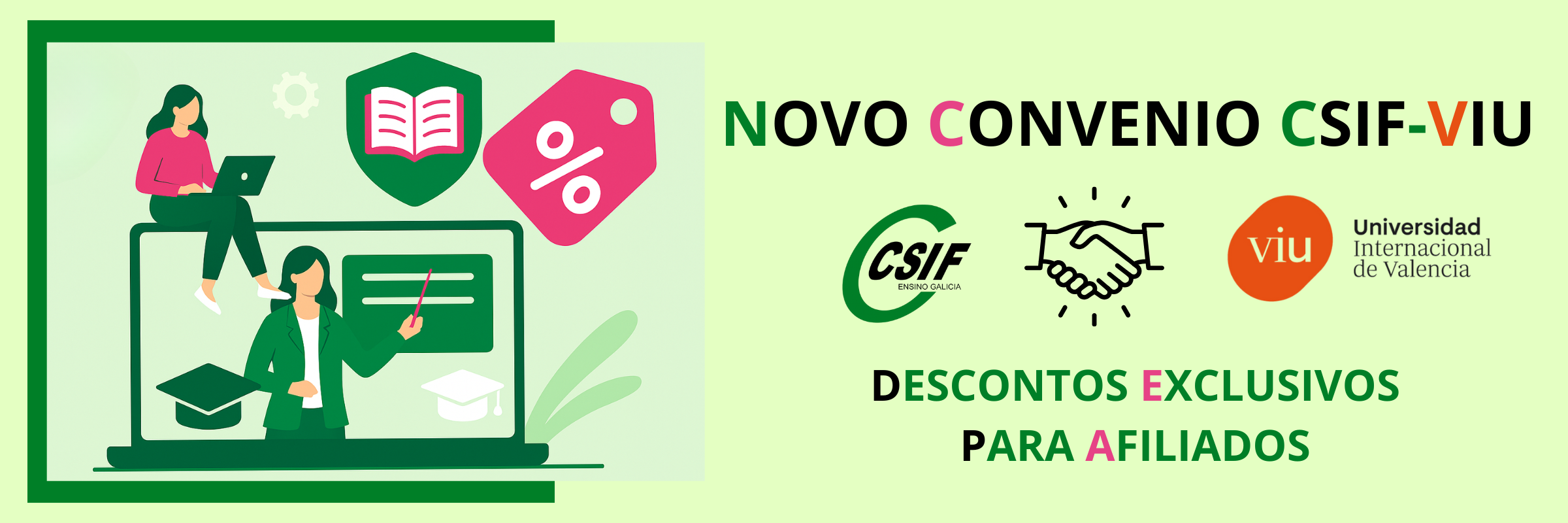 En CSIF seguimos traballando para acompañar ao profesorado e futuros docentes no seu desenvolvemento profesional. Grazas ao noso convenio coa Universidade Internacional de Valencia (VIU), o noso persoal afiliado pode acceder a Graos e Másteres Oficiais en Educación en modalidade 100 % online, que contan como méritos en procesos de oposición.