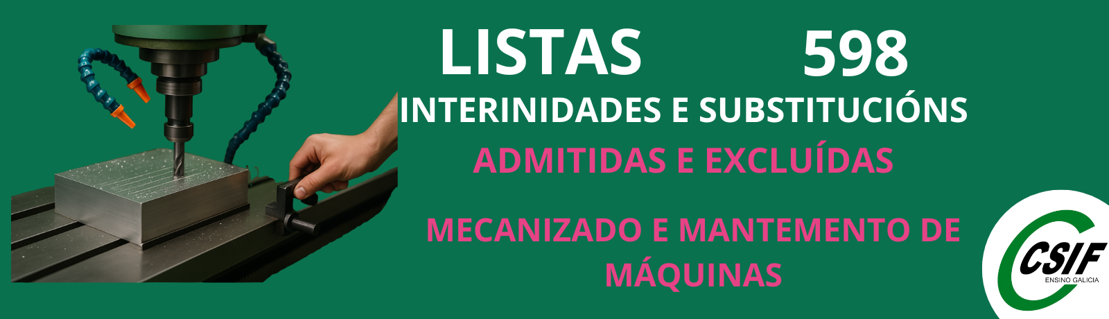 Apróbase e publícase a relación provisional de persoas admitidas e excluídas e o baremo provisional para a especialidade 598005 Mecanizado e mantemento de máquinas, coas instrucións para presentar alegacións a través do ED003A.
