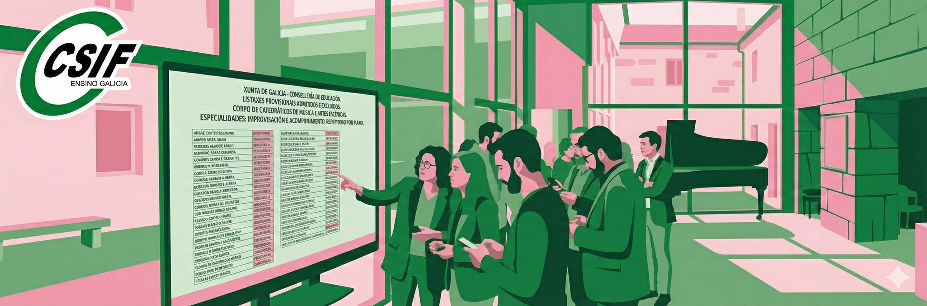 Hoxe publicouse a Resolución do 5 de decembro de 2025 da Dirección Xeral de Centros e Recursos Humanos, pola que se aproba e publica a relación provisional de persoas admitidas e excluídas e o baremo provisional no procedemento para a elaboración das listas de interinidades e substitucións para impartir docencia no corpo de catedráticos de música e artes escénicas (593), nas especialidades seguintes (código de procedemento ED003A).