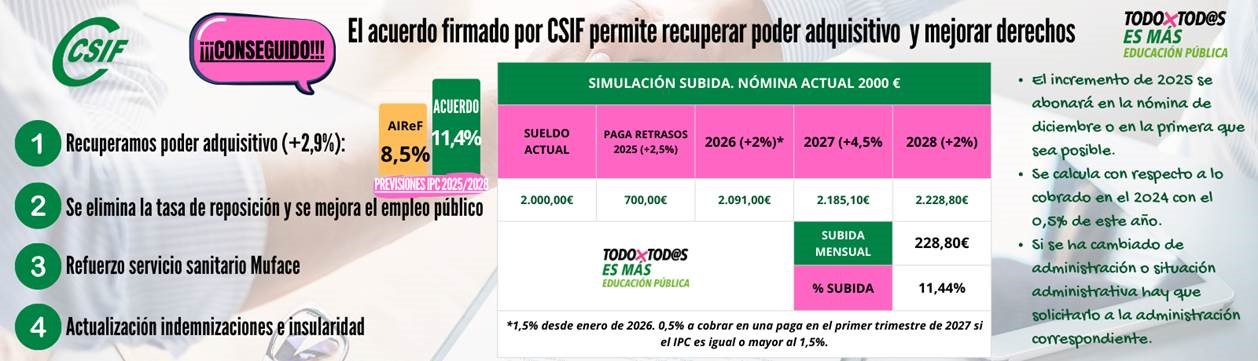 Tras o acordo asinado por CSIF co Goberno de España e coa publicación do Real Decreto-lei 14/2025, procédese a actualizar as retribucións do 2025 cunha subida do 2,5% e as nóminas do 2026 cunha subida inmediata do 1,5% e unha actualización do 0,5% máis.