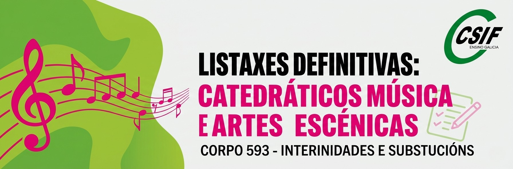 Publícase a resolución definitiva pola que se aproba e publica a relación definitiva de persoas admitidas e excluídas, así como o baremo definitivo, no procedemento de elaboración das listas de interinidades e substitucións para impartir docencia en diversas especialidades do corpo de catedráticos/as de música e artes escénicas (593)código de procedemento ED003A. :contentReference[oaicite:0]{index=0}