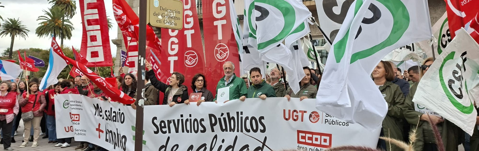 CSIF, UGT Servizos Públicos e a área Pública de CCOO convocaron concentracións hoxe 30 de outubro fronte ao Ministerio para a Transformación Dixital e da Función Pública, así como ante as Delegacións e Subdelegacións do Goberno en toda España, por uns servizos públicos de calidade, incrementos salariais, máis emprego e mellora das condicións laborais para máis de tres millóns e medio de empregadas e empregados públicos. En Galicia as concentracións tiveron lugar na Coruña fronte á Delegación do Goberno e en Lugo, Ourense e Pontevedra fronte ás sedes das Subdelegacións do Goberno.