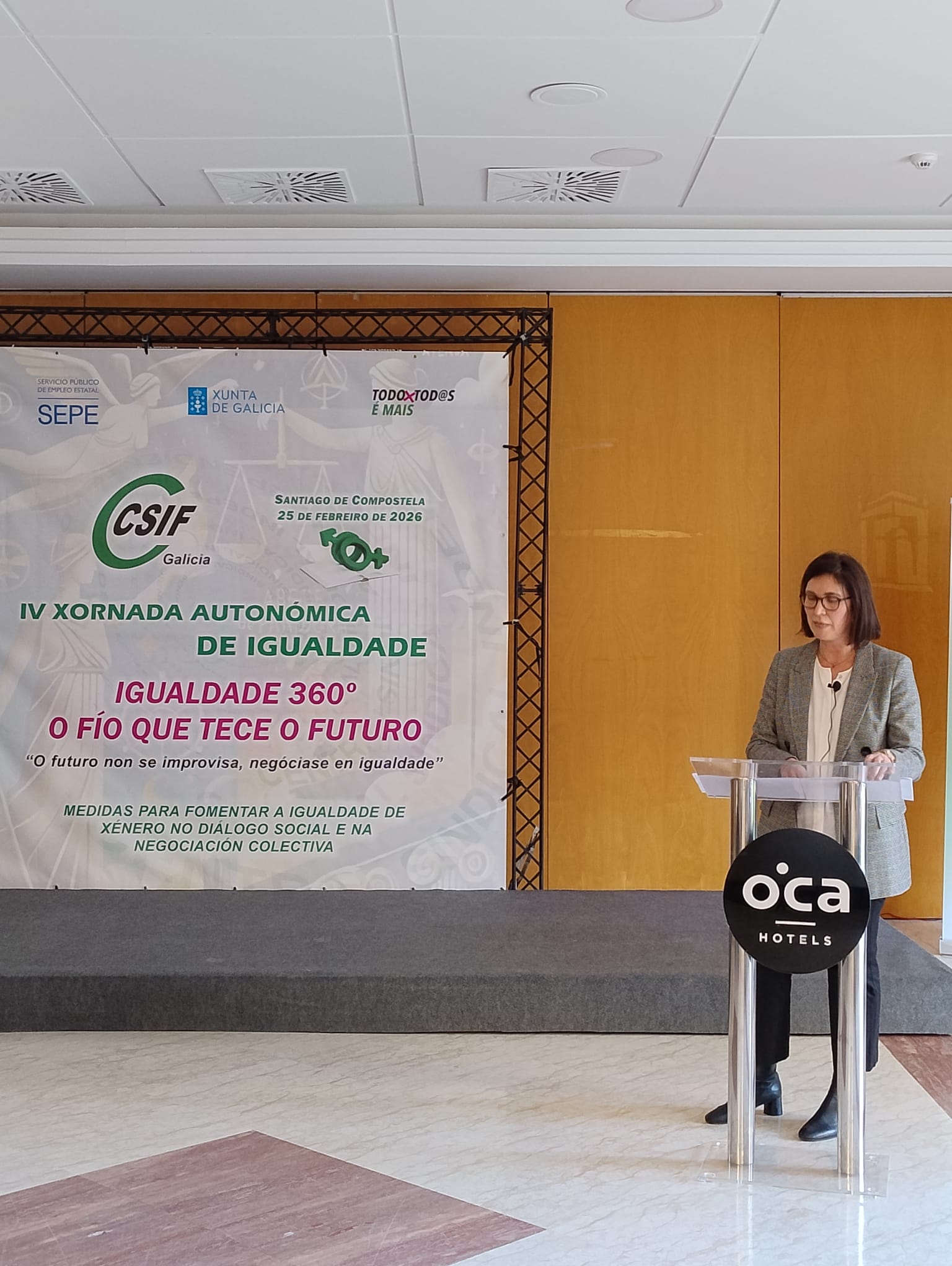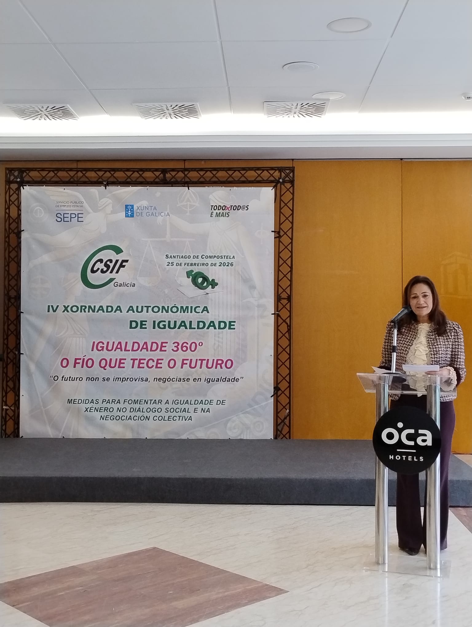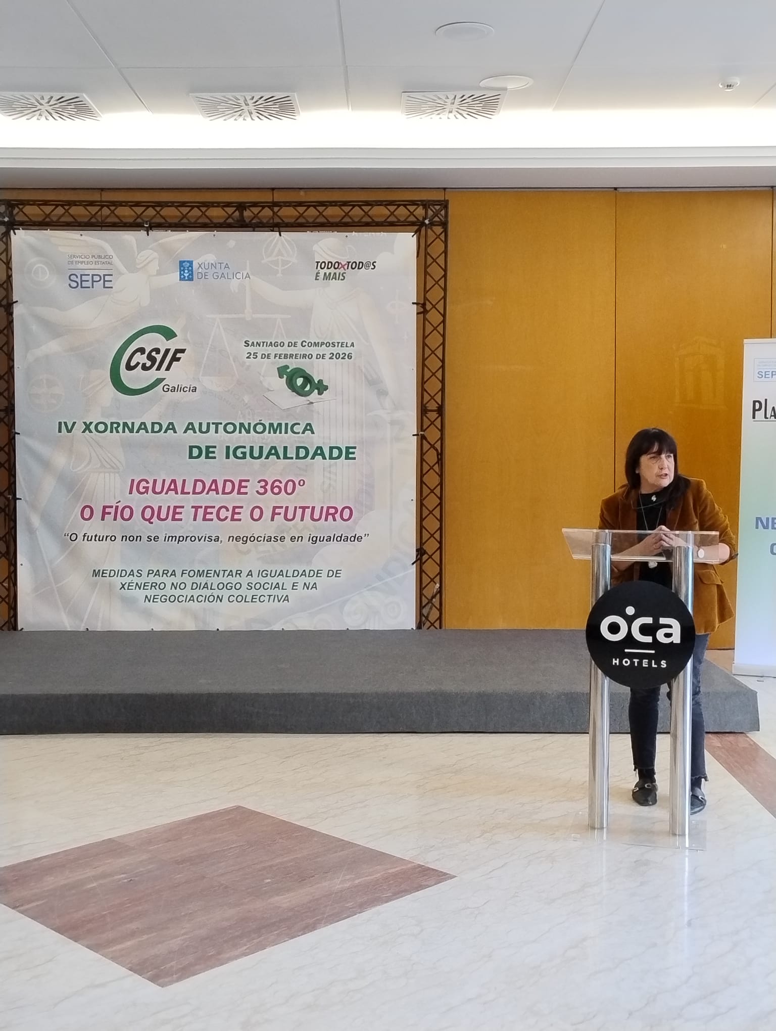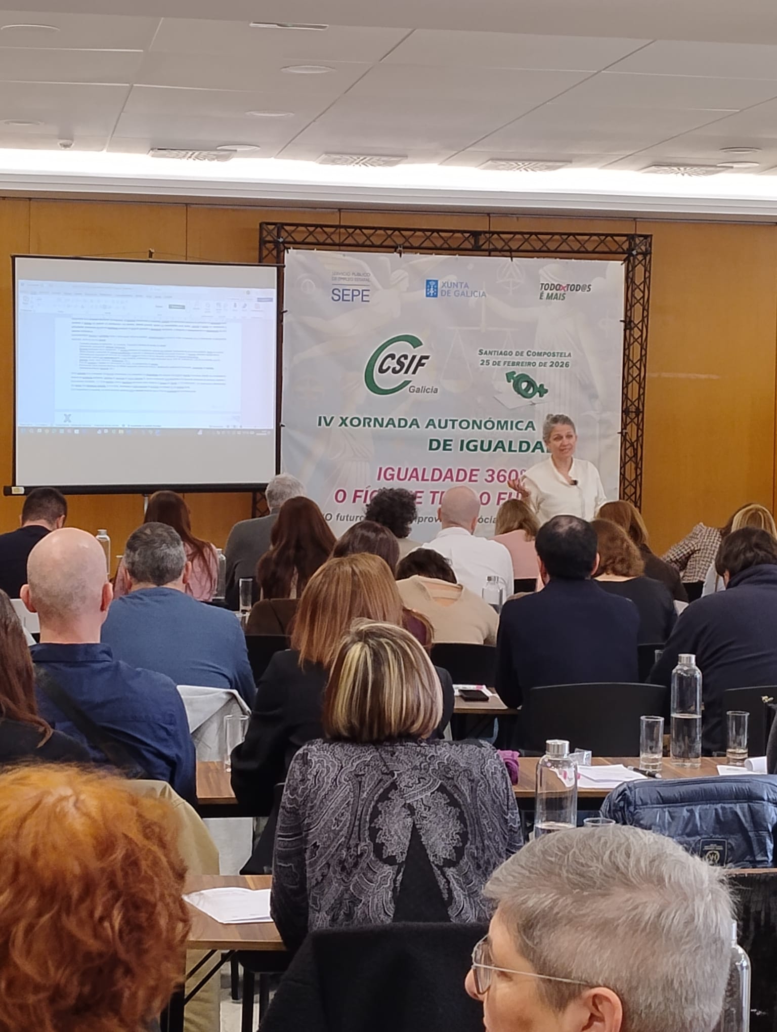 Bajo el lema Igualdade 360º: O fío que tece o futuro , delegados y delegadas de CSIF Galicia participaron hoy en Santiago en la IV Jornada Autonómica de Igualdad, un encuentro que sirvió para analizar y fomentar medidas que garanticen la equidad de género a través del diálogo social y la negociación colectiva, tanto en salarios, como en corresponsabilidad y en salud mental.