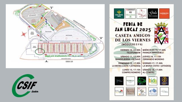 En esta feria San Lucas 2025, los afiliados y afiliadas a CSIF Jaén podéis disfrutar de un 10% descuento en la caseta "Amigos de los viernes", situada en los módulos 5 y 6 (Adjuntamos mapa). Para ello, solo tienes que presentar tu carnet de afiliación, bien de forma física o enseñando al personal de la caseta la pantalla de Carnet de afiliado/a de tu app CSIF Andalucía.
