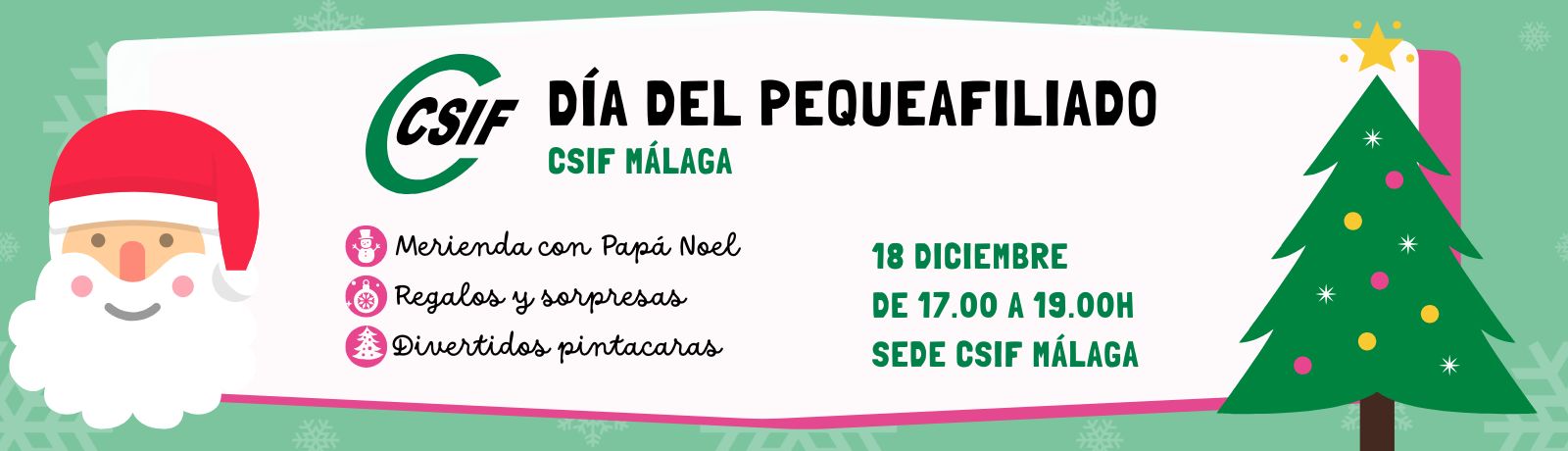 El 'Día del Pequeafiliado' tendrá lugar el jueves 18 de diciembre en horario de tarde (de 17:00 a 19:00 horas) con el objetivo de originar un punto de encuentro para todos los que conformamos la gran familia que es CSIF Málaga. Algo que cobra mayor importancia en las fechas tan especiales en las que se celebra.