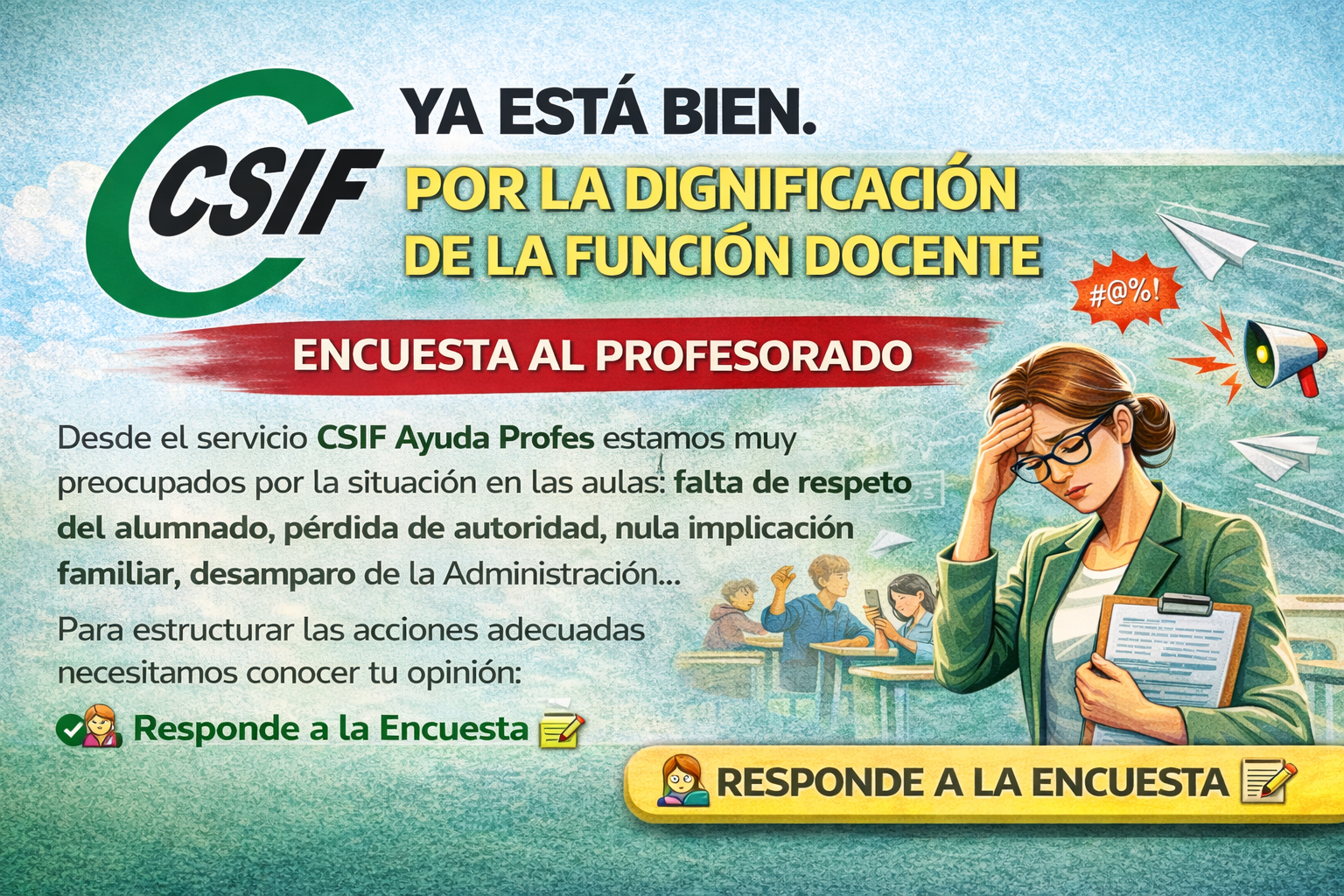 Desde el servicio CSIF Ayuda Profes estamos muy preocupados por la situación que se está viviendo cada día en las aulas de nuestro país. Las constantes faltas de respeto por parte del alumnado, la pérdida de autoridad del profesorado, la nula implicación de las familias, el desamparo de la Administración… Estos factores menoscaban la dignidad del docente y conducen inequívocamente al síndrome del profesor quemado.