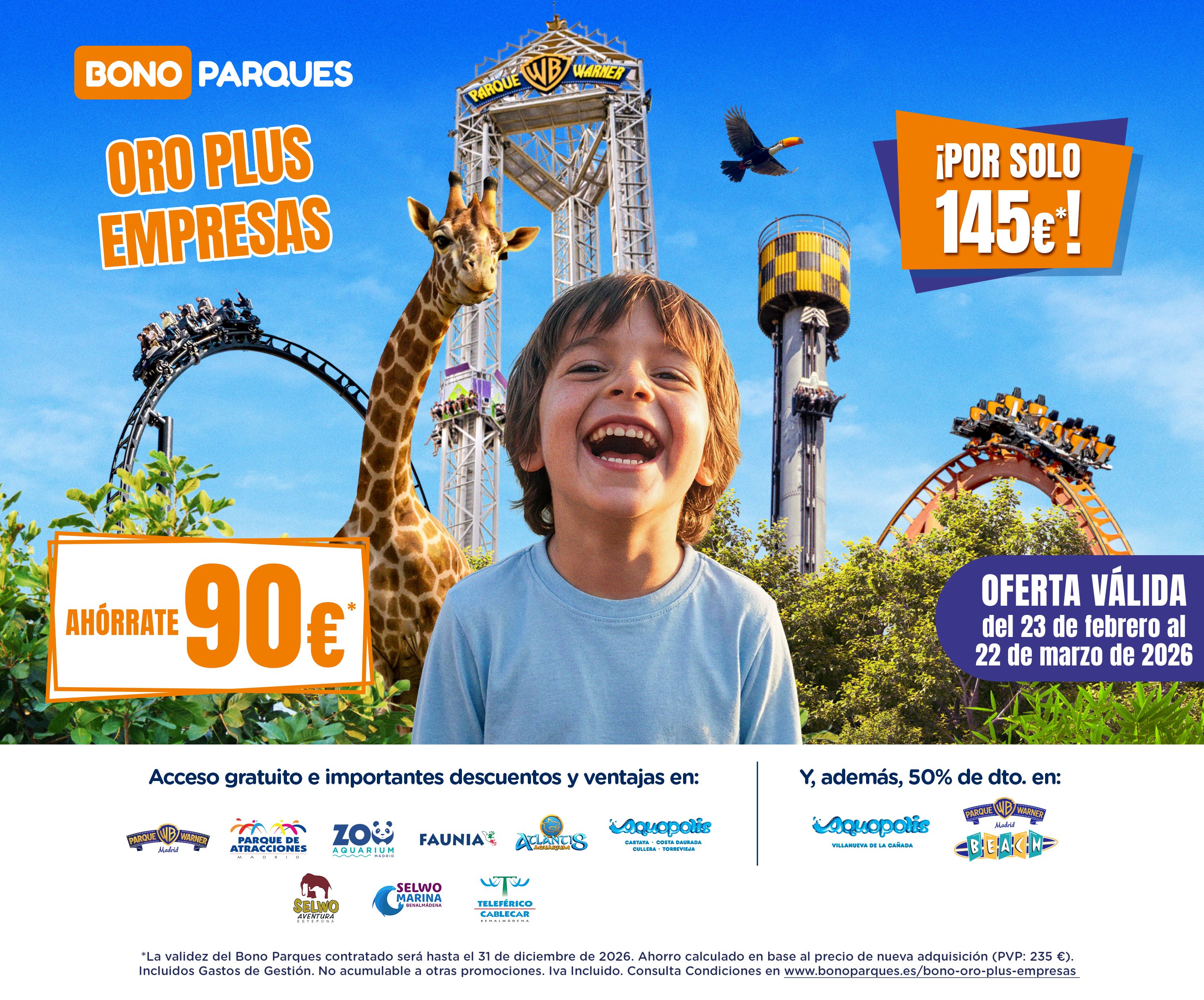 El precio del Bonoparques Oro Plus Empresas es 235€ pero, gracias al acuerdo al que hemos llegado desde el Club CSIF, tú puedes conseguirlo al precio exclusivo de 145€ hasta el 22/03/2026.
