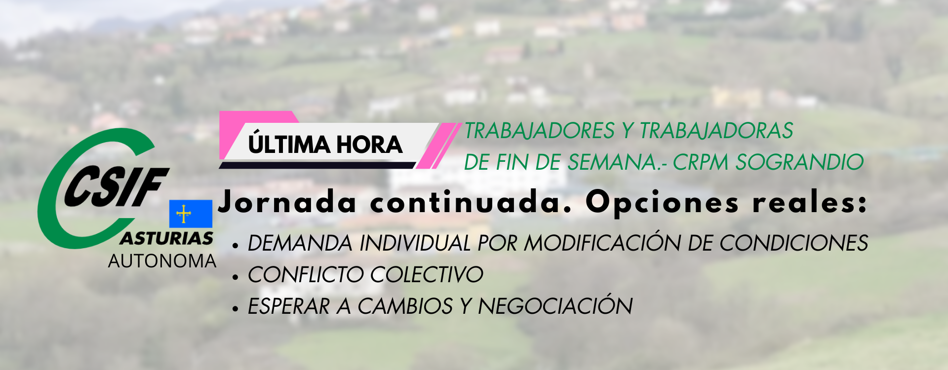 Después de hablar con el servicio jurídico de CSIF, queremos trasladar a los compañeros y compañeras de fin de semana del CRPM Sograndio cuáles son las tres opciones reales que hay ahora mismo sobre la mesa para el tema de la jornada continuada, para que cada cual pueda decidir con toda la información y sin sorpresas.
