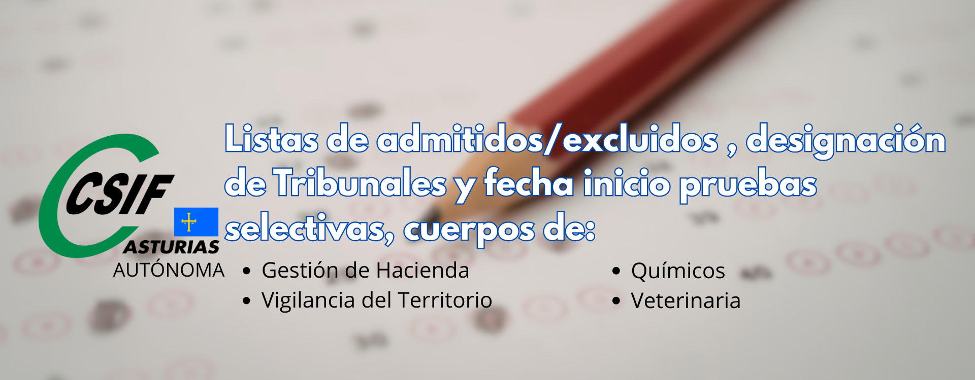 - Resolución de 16 de enero de 2026, de la Consejería de Presidencia, Reto Demográfico, Igualdad y Turismo, por la que se aprueba la lista provisional de personas admitidas y excluidas, la designación del Tribunal Calificador y el comienzo de las pruebas selectivas para la provisión de 17 plazas del Cuerpo de Veterinaria, Grupo A, Subgrupo A1, en turno de acceso libre y turno de promoción interna, en régimen de funcionario/a de carrera de la Administración del Principado de Asturias (BOPA de 20 de marzo de 2025).