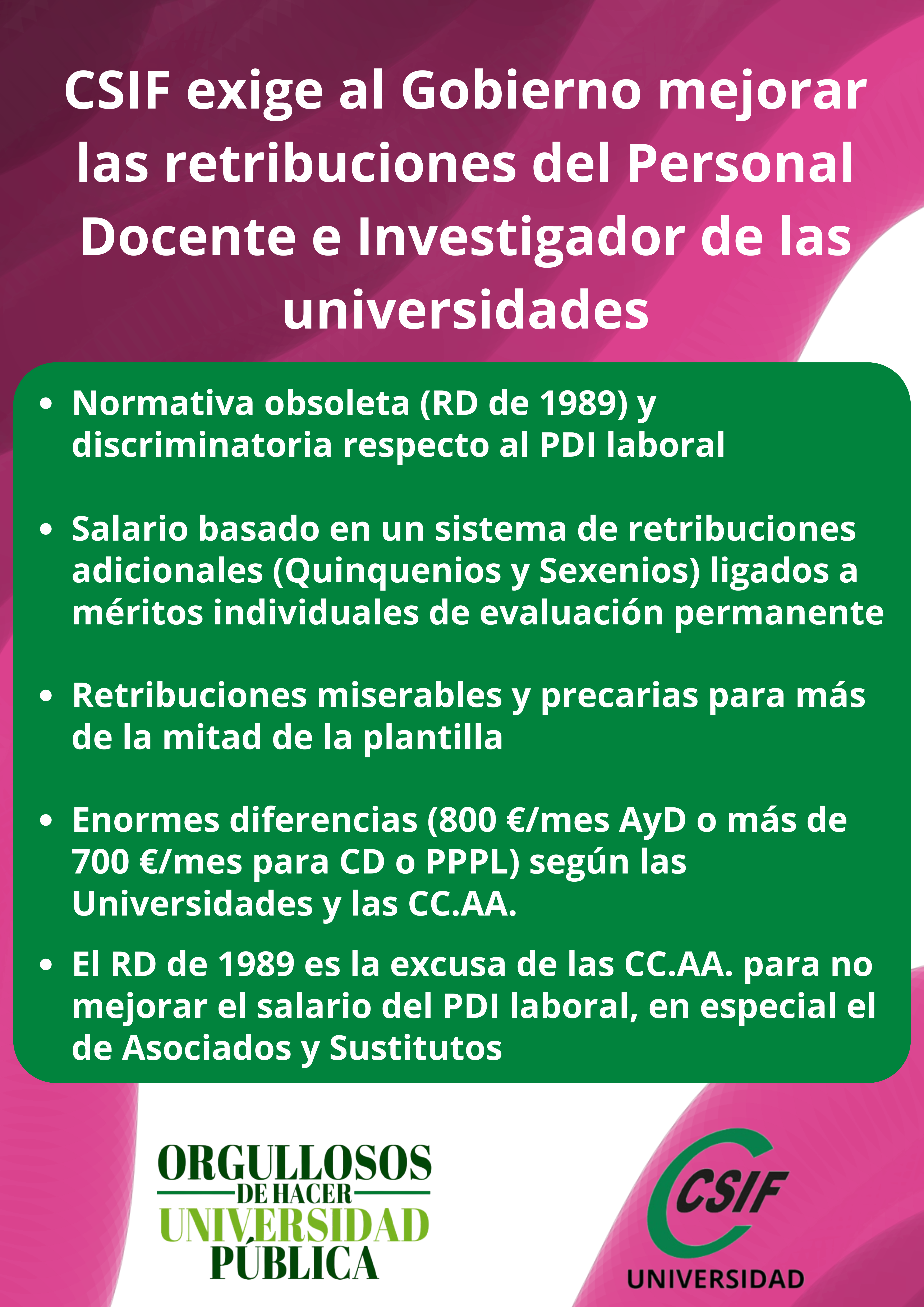 Finalmente desde CSIF queremos denunciar la desigualdad que suponen las enormes diferencias retributivas entre el PDI laboral según la Universidad o la Comunidad Autónoma en la que se trabaje. Dos ejemplos significativos: