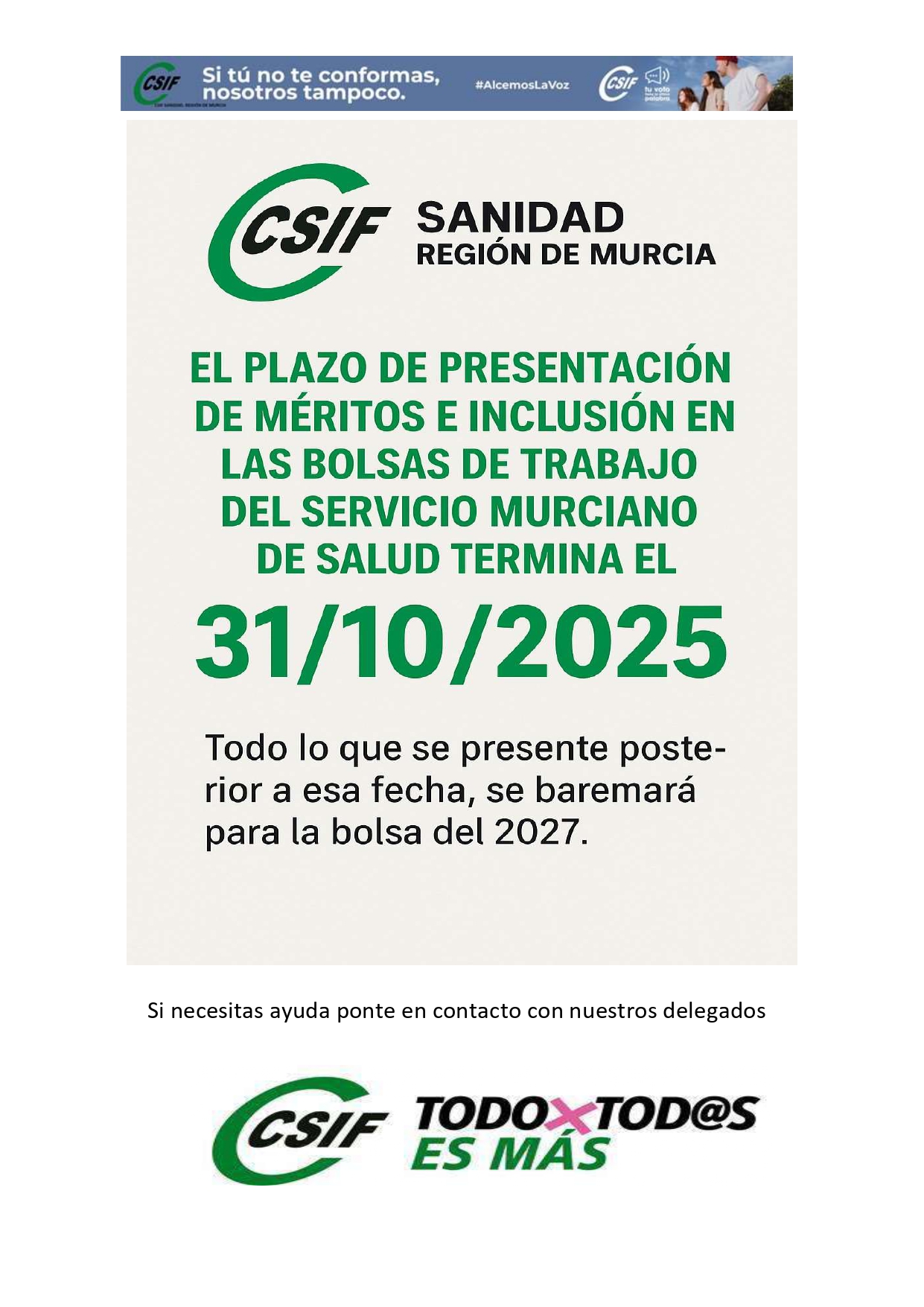 CSIF Sanidad Región de Murcia informa que el plazo de presentación de méritos e inclusión en las bolsas de trabajo del Servicio Murciano de Salud termina el: 31-10-2025