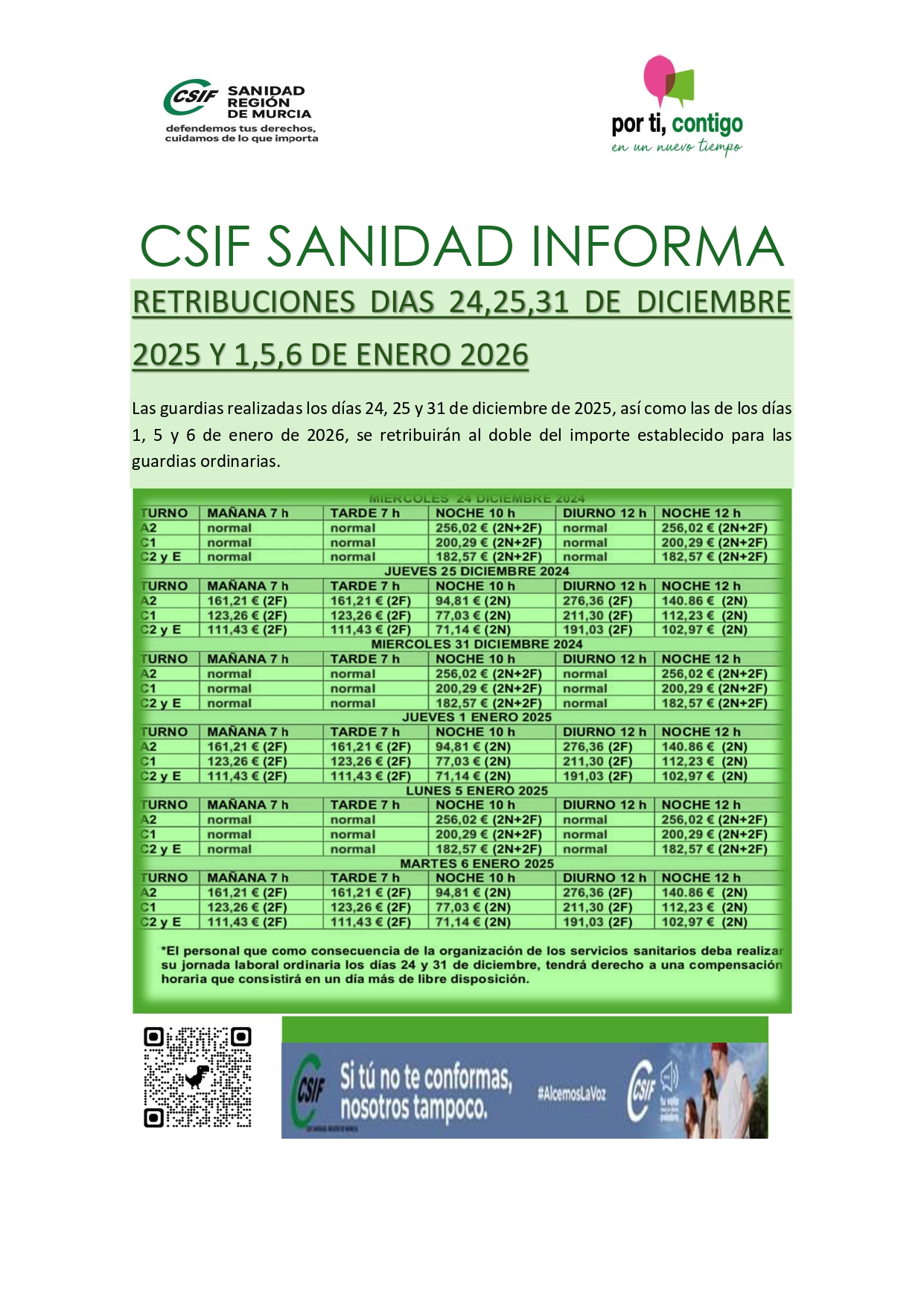 CSIF Sanidad Región de Murcia informa de las retribuciones correspondientes a las guardias realizadas durante los días festivos de Navidad y Año Nuevo.