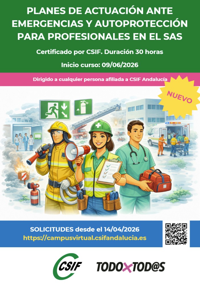 Informamos que se encuentra disponible en el Campus Virtual CSIF Andalucía el curso PLANES DE ACTUACIÓN ANTE EMERGENCIAS Y AUTOPROTECCIÓN PARA PROFESIONALES EN EL SERVICIO ANDALUZ DE SALUD, CERTIFICADO POR CSIF. Se trata de un curso organizado e impartido por CSIF y sin la participación de ningún organismo público. Dirigido exclusivamente a afiliados/as a CSIF Andalucía.