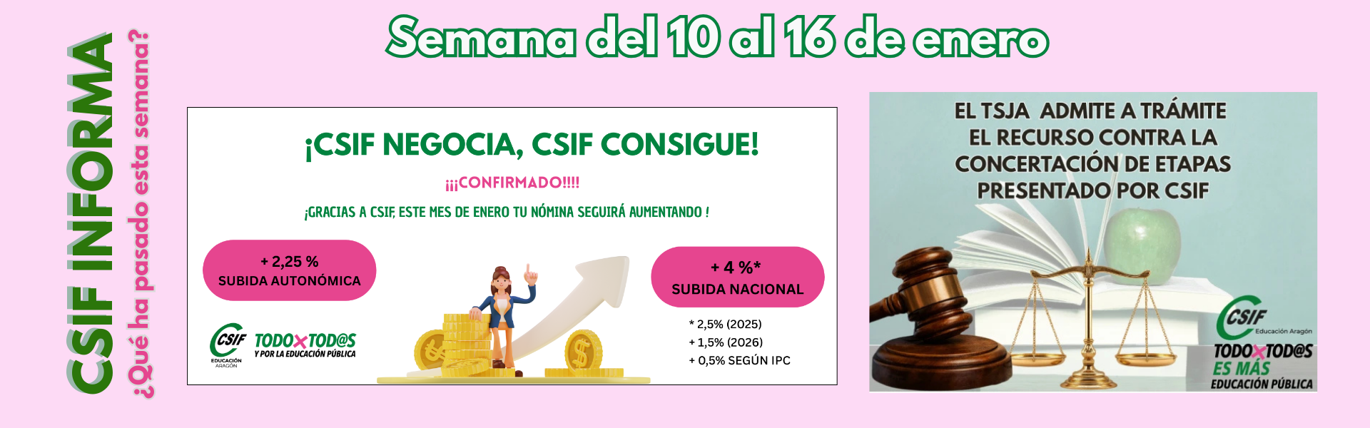 - El sindicato CSIF firmó en solitario el acuerdo autonómico para el incremento salarial de los docentes de la escuela pública aragonesa. Esta firma, sumada al acuerdo alcanzado por el sindicato a nivel nacional para la subida salarial de los funcionarios, supone un impulso decisivo. Gracias a la combinación de ambos logros, los docentes aragoneses abandonan los últimos puestos de las tablas salariales a nivel estatal.