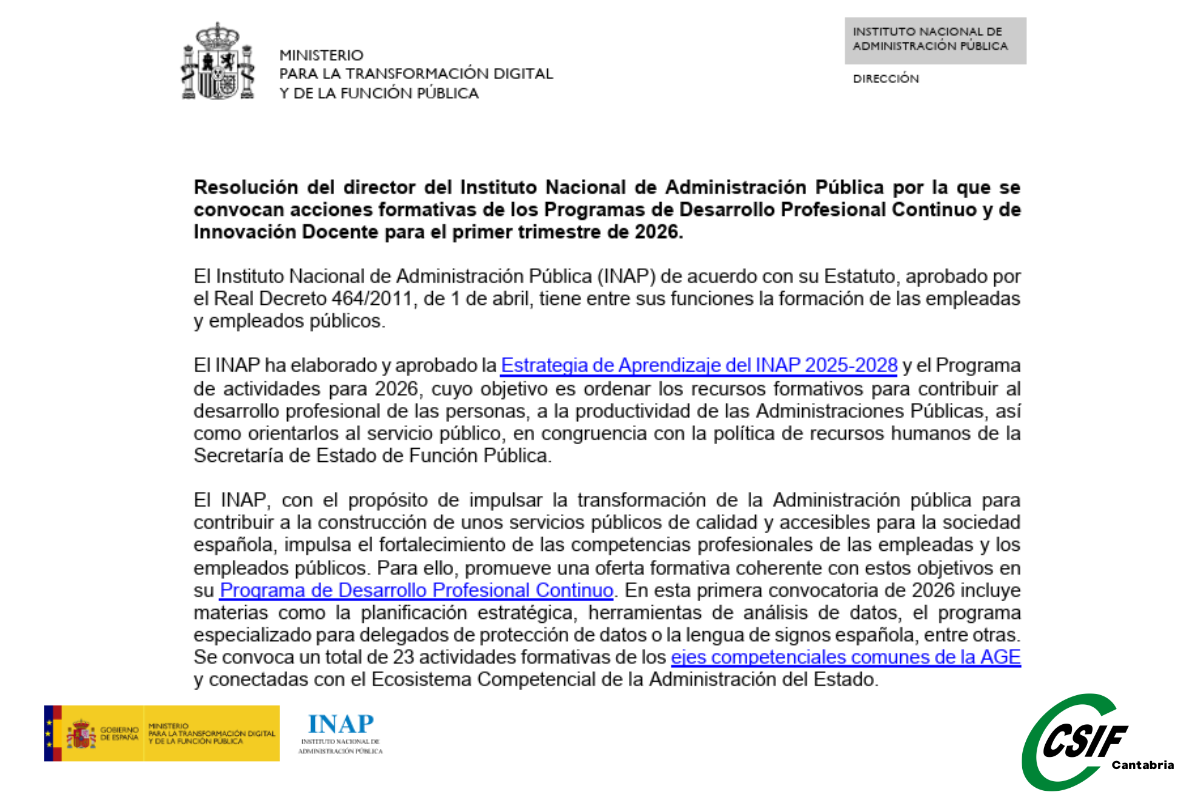 La Central Sindical Independiente y de Funcionarios (CSIF), sindicato más representativo en las administraciones públicas y con presencia creciente en el sector privado, informa de la publicación de la resolución de 16 de diciembre de 2025 del Instituto Nacional de Administración Pública por la que se convocan un total de de 23 actividades formativas de los ejes competenciales comunes de la AGE y conectadas con el Ecosistema Competencial de la Administración del Estado.