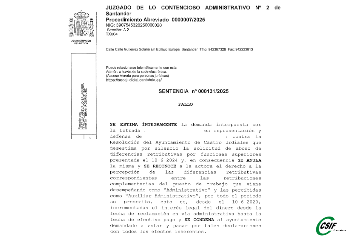 La Asesoría Jurídica de CSIF Cantabria ha logrado una importante sentencia favorable para una funcionaria del Ayuntamiento de Castro Urdiales, reconociendo su derecho a percibir las diferencias salariales correspondientes por haber desempeñado, de forma continuada, funciones propias de un puesto de categoría superior durante años.