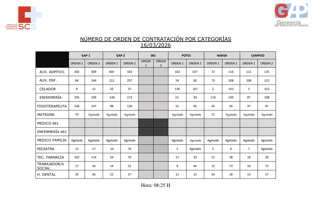 En las siguientes tablas os informamos, por categorías, del número por el que van llamando en las diferentes Gerencias del SCS para contratos eventuales