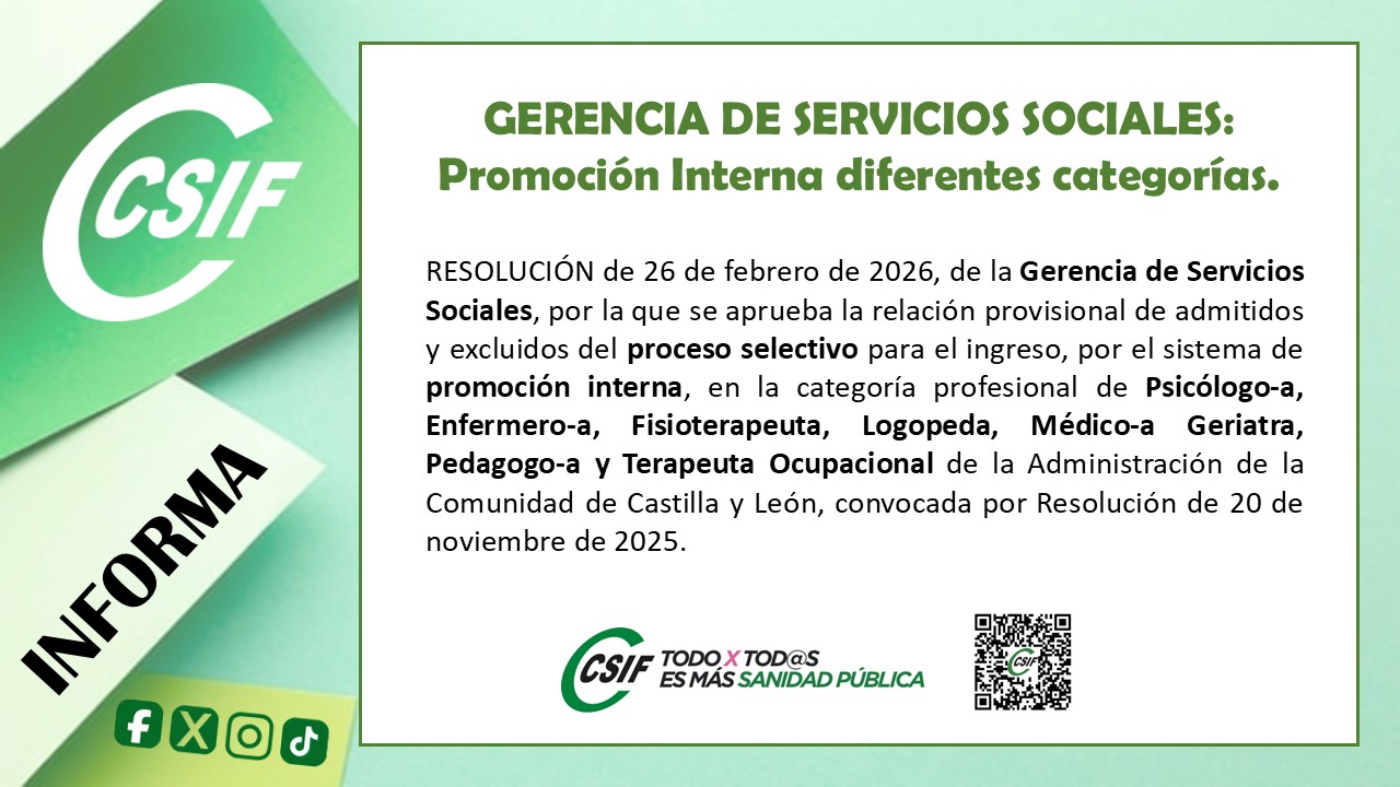 RESOLUCIÓN de 26 de febrero de 2026, de la Gerencia de Servicios Sociales, por la que se aprueba la relación provisional de admitidos y excluidos del proceso selectivo para el ingreso, por el sistema de promoción interna, en la categoría profesional de Enfermero-a de la Administración de la Comunidad de Castilla y León, convocada por Resolución de 20 de noviembre de 2025.