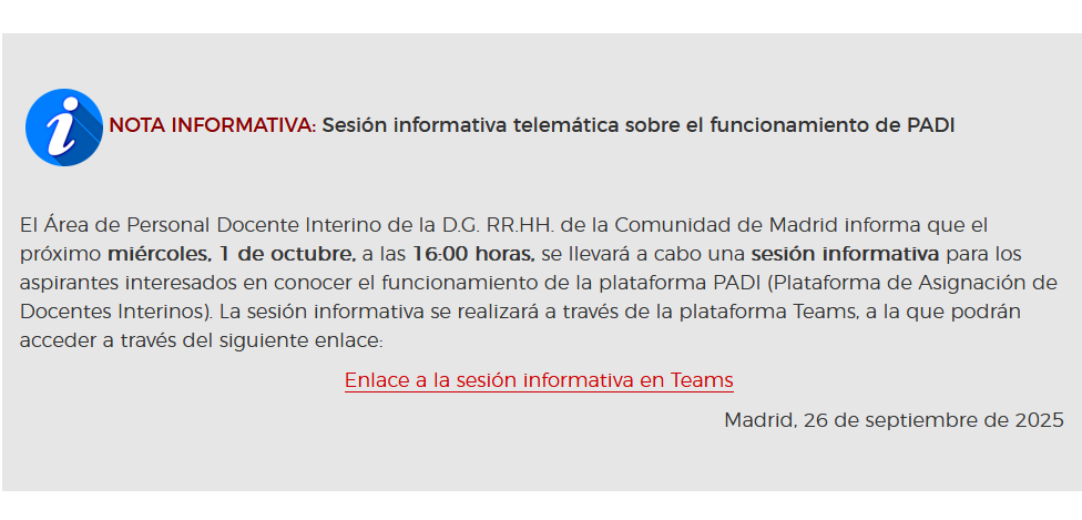El Área de Personal Docente Interino de la D.G. RR.HH. de la Comunidad de Madrid informa que el próximo miércoles, 1 de octubre, a las 16:00 horas, se llevará a cabo una sesión informativa para los aspirantes interesados en conocer el funcionamiento de la plataforma PADI (Plataforma de Asignación de Docentes Interinos). La sesión informativa se realizará a través de la plataforma Teams, a la que podrán acceder a través del siguiente enlace: