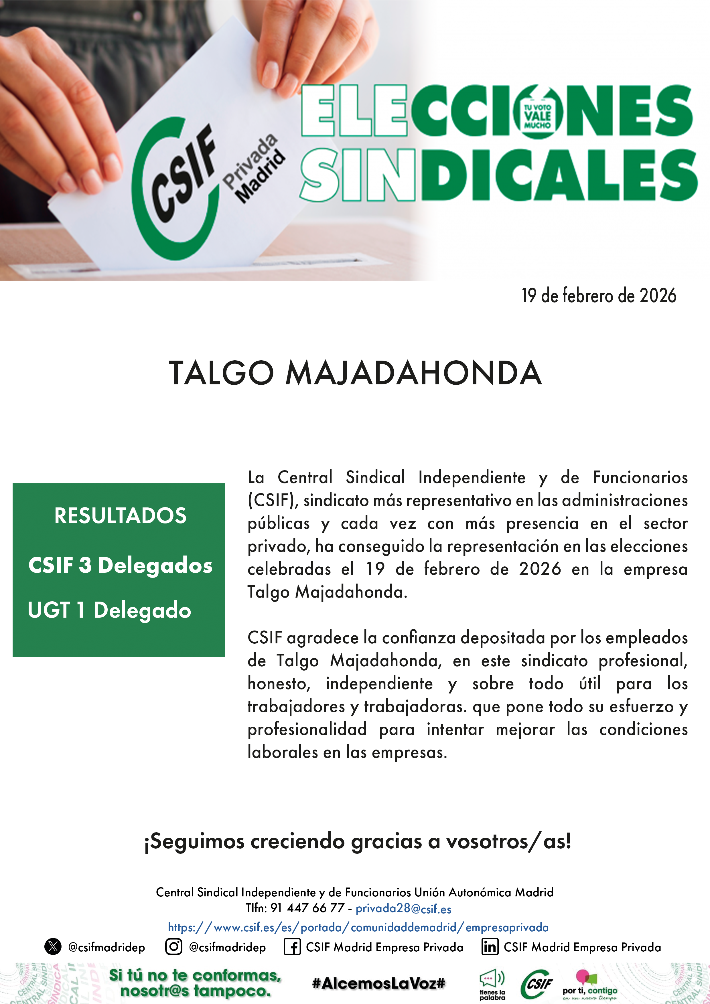 La Central Sindical Independiente y de Funcionarios (CSIF), sindicato más representativo en las administraciones públicas y cada vez con más presencia en el sector privado, ha conseguido la representación en las elecciones celebradas el 19 de febrero de 2026 en la empresa Talgo Majadahonda.