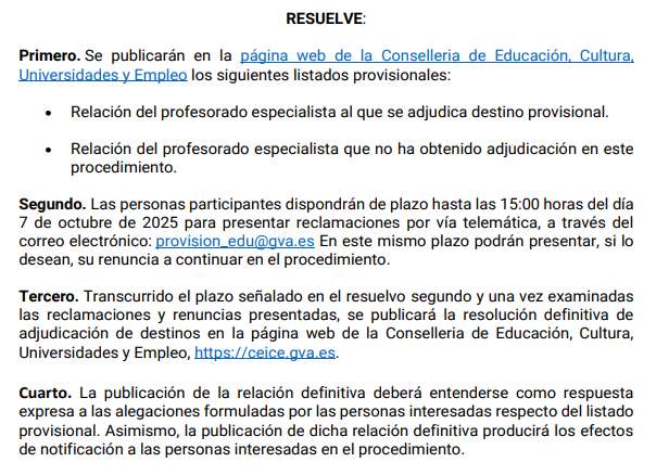 - Resolución de 29 de septiembre de 2025, del director general de Personal Docente, por la que se convoca el acto de adjudicación de puestos de trabajo destinados a personal especialista