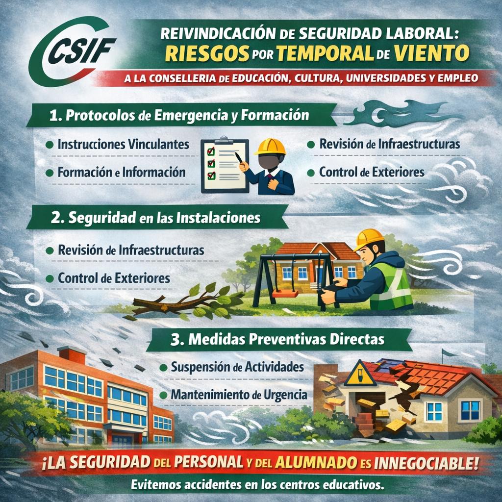El sindicato CSIF ha presentado hoy, ante el Comité de Seguridad y Salud Laboral de Conselleria de Educación, un escrito en el que advierte de los riesgos que genera el temporal de viento y exige las máximas medidas de prevención. La central sindical propone el impulso de protocolos de emergencia, seguridad en las instalaciones o medidas directas.