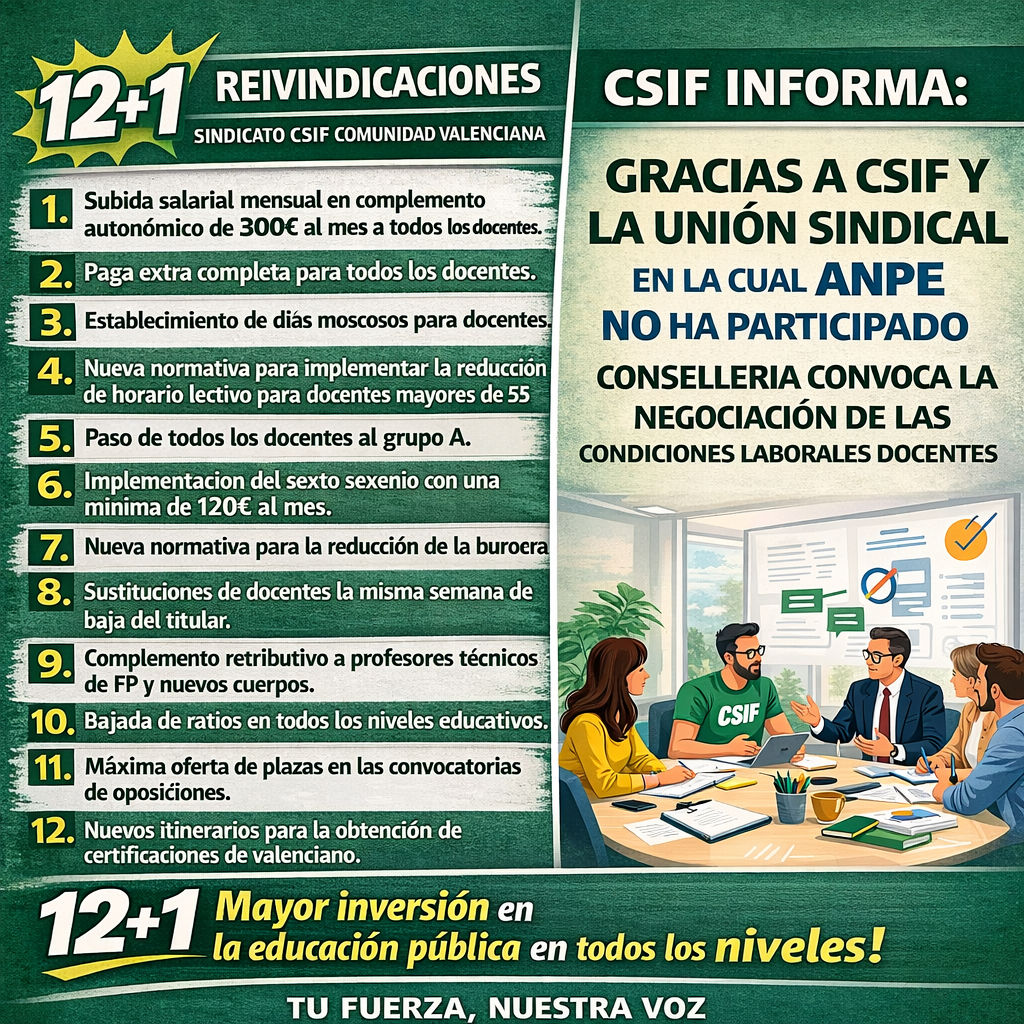 GRACIAS A CSIF Y A LA UNIÓN SINDICAL —EN LA CUAL ANPE NO HA PARTICIPADO—, CONSELLERIA CONVOCA LA NEGOCIACIÓN DE LAS CONDICIONES LABORALES DOCENTES