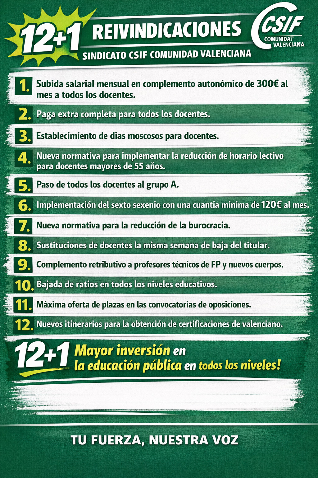 Desde CSIF valoramos que las movilizaciones comienzan a dar sus primeros frutos. La presión ejercida por el profesorado, con acciones como la huelga del pasado 11 de diciembre así como diferentes movilizaciones, han sido determinantes para que la Conselleria acceda finalmente a sentarse a negociar. En esta reunión, el sindicato defenderá al menos sus 12+1 reivindicaciones, situando como prioridad la subida salarial del profesorado, junto a otras mejoras necesarias en las condiciones laborales.