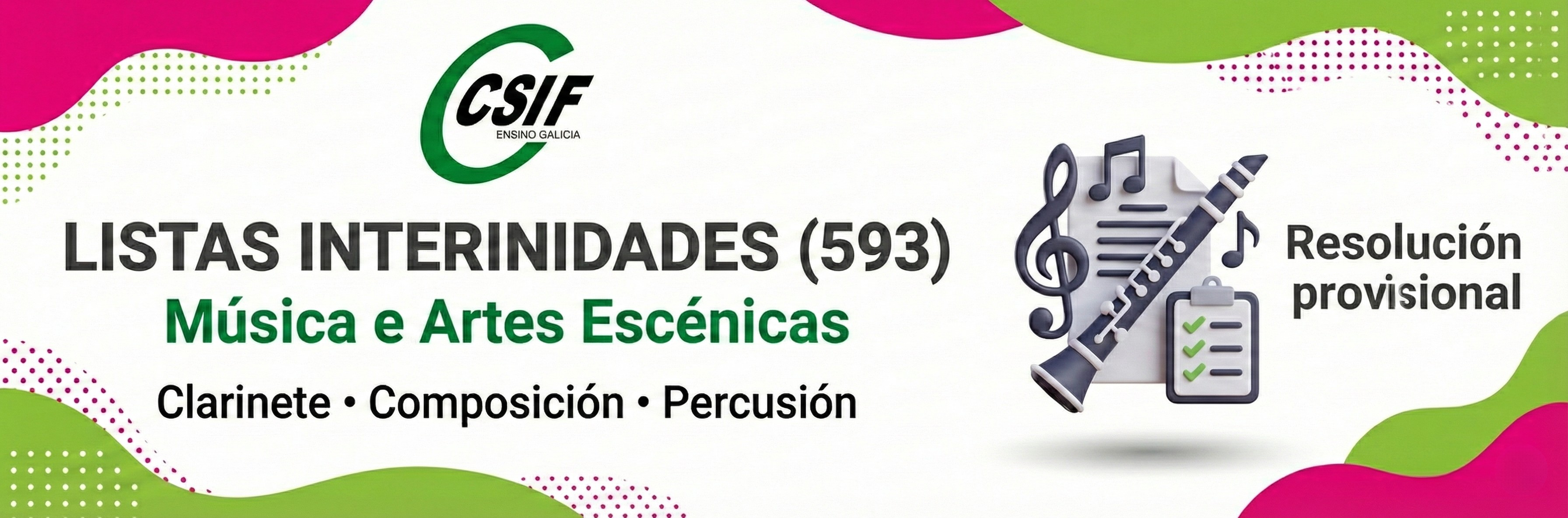 A Dirección Xeral de Centros e Recursos Humanos publicou a resolución provisional pola que se aproban e fan públicas a relación provisional de persoas admitidas e excluídas e o baremo provisional do procedemento de elaboración das listas de interinidades e substitucións do corpo de catedráticos/as de música e artes escénicas (593).