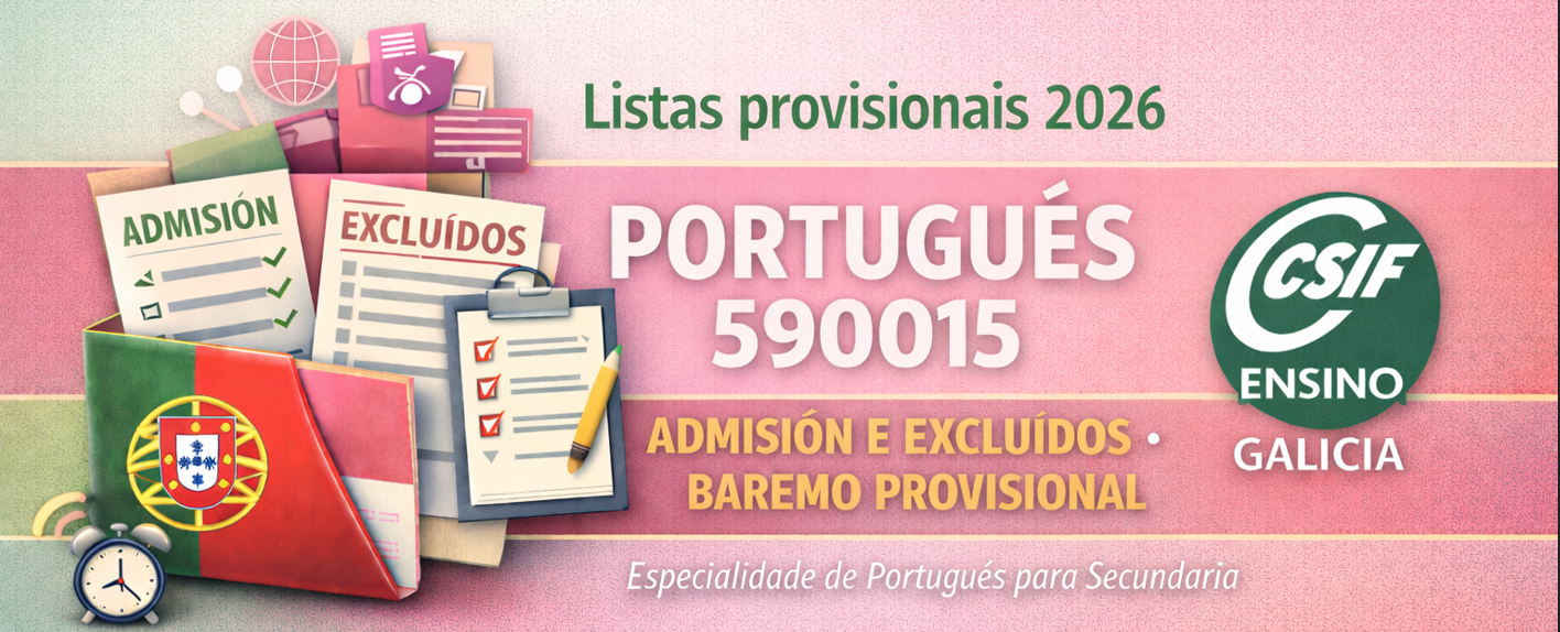 Publicada a Resolución do 13 de febreiro de 2026 da Dirección Xeral de Centros e Recursos Humanos, pola que se aproba e fai pública a relación provisional de persoas admitidas e excluídas e o baremo provisional no procedemento de elaboración das listas de interinidades e substitucións para impartir docencia na especialidade de Portugués (590015) (procedemento ED003A).