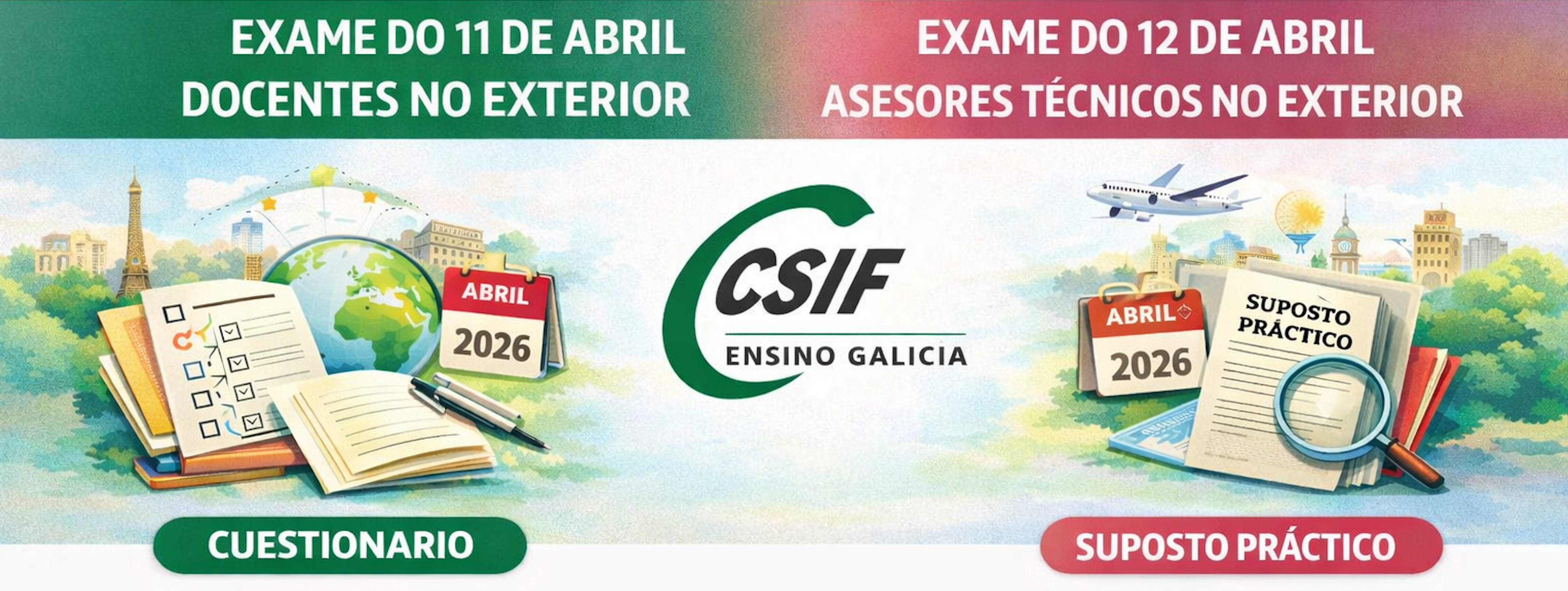 Preséntanse a continuación os documentos correspondentes aos exames celebrados os días 11 e 12 de abril de 2026 no proceso selectivo no exterior, diferenciando en cada caso entre cuestionario e suposto práctico.