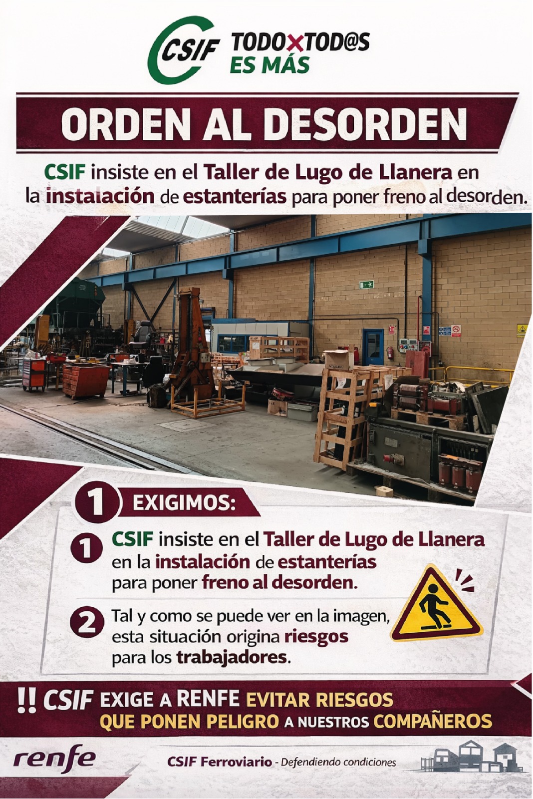 CSIF exige a Renfe la instalación de estanterías en el taller de Lugo de Llanera para evitar riesgos a los trabajadores