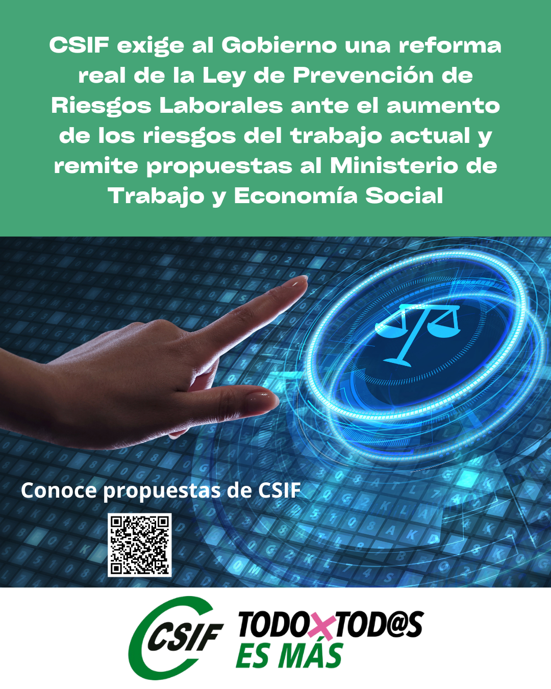 La Central Sindical Independiente y de Funcionarios (CSIF), sindicato más representativo en las administraciones públicas y con presencia creciente en el sector privado, ha trasladado al Ministerio de Trabajo y Economía Social un amplio y ambicioso paquete de propuestas en el marco de la consulta pública para la actualización de la Ley 31/1995 de Prevención de Riesgos Laborales (LPRL) y del Reglamento de los Servicios de Prevención, con el objetivo de convertir la prevención en una herramienta real y eficaz, adaptada a la actual realidad del trabajo en España.