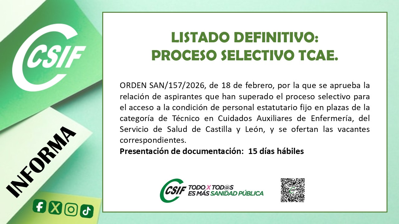 ORDEN SAN/157/2026, de 18 de febrero, por la que se aprueba la relación de aspirantes que han superado el proceso selectivo para el acceso a la condición de personal estatutario fijo en plazas de la categoría de Técnico en Cuidados Auxiliares de Enfermería, del Servicio de Salud de Castilla y León, y se ofertan las vacantes correspondientes.