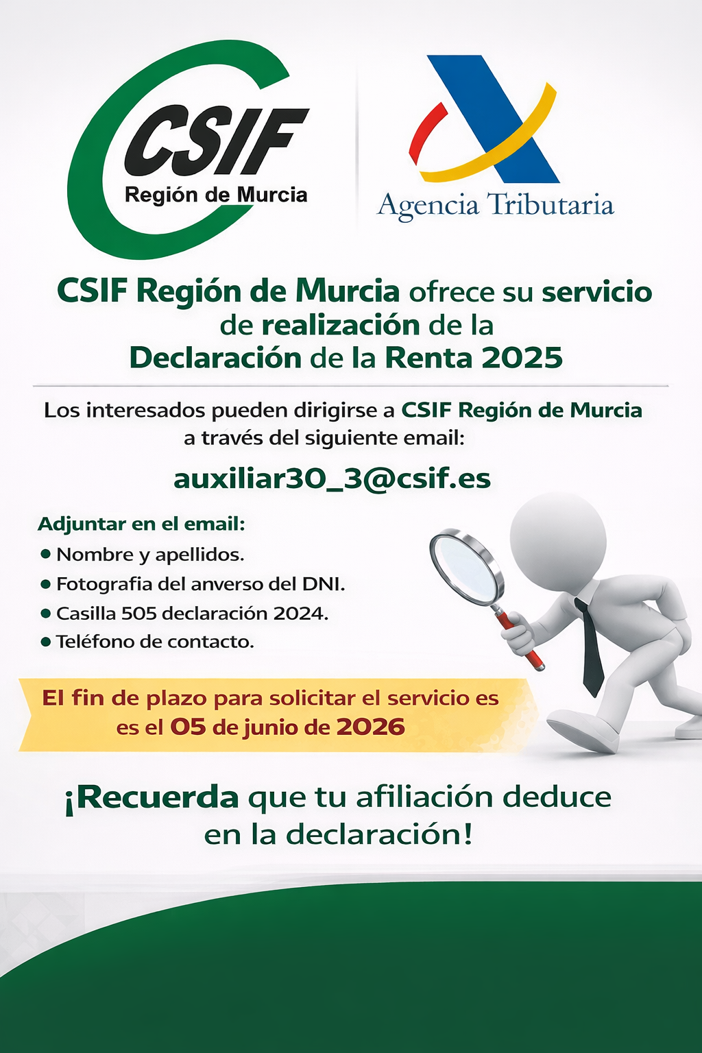 CSIF Región de Murcia pone a disposición de sus afiliados, un año más, su servicio de asesoramiento y realización de la Declaración de la Renta correspondiente al ejercicio 2025.