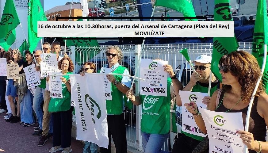 La Central Sindical Independiente y de Funcionarios (CSIF Región de Murcia), sindicato más representativo en las administraciones públicas y con presencia creciente en el sector privado, a través de su sector de AGE, participará en la concentración convocada junto a CCOO y UGT el próximo jueves 16 de octubre a las 10:30 horas en la Plaza del Rey de Cartagena, frente a la puerta del Arsenal. Esta acción forma parte del calendario de movilizaciones en defensa de una mejora salarial justa para el personal civil del Ministerio de Defensa.