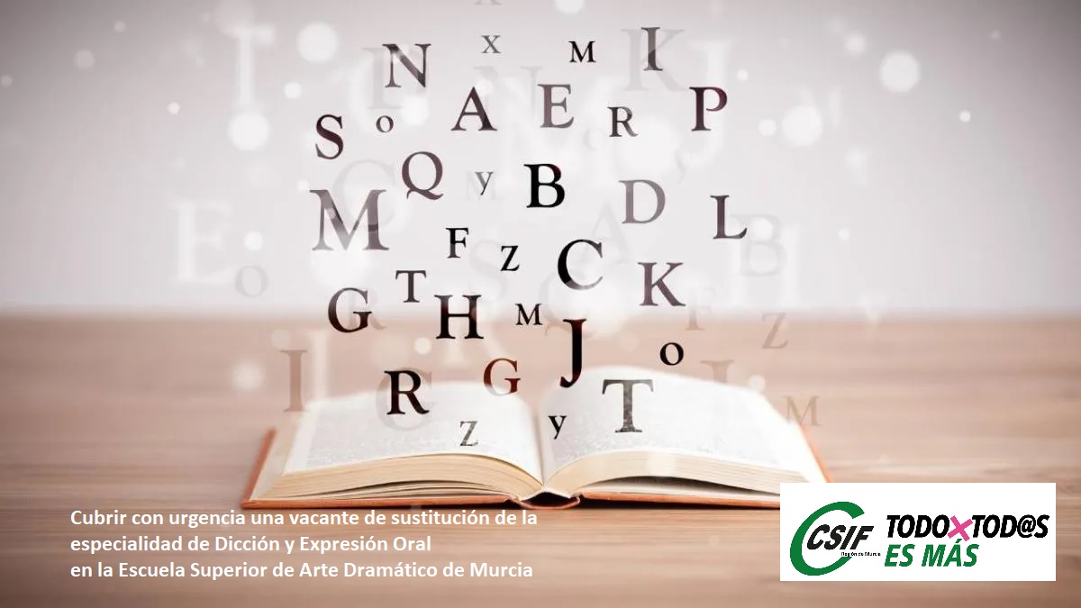 1. Con objeto de cubrir con urgencia una vacante de sustitución de la especialidad de Dicción y Expresión Oral en la Escuela Superior de Arte Dramático de Murcia, y posibles sustituciones que se puedan producir de dicha especialidad durante el curso 2025/2026, se declara abierta durante el curso 25-26 la lista de la siguiente especialidad: